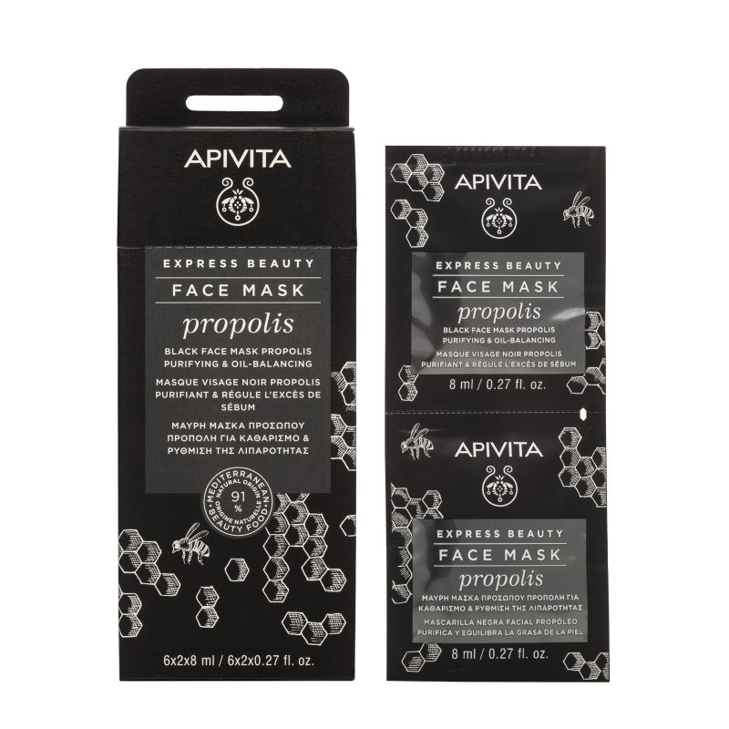Η μαύρη μάσκα προσώπου EXPRESS BEAUTY με πρόπολη, ένα παραδοσιακό γιατρικό της Μεσογείου με αντιμικροβιακή δράση, καθαρίζει σε βάθος και εξισορροπεί τις λιπαρές επιδερμίδες, ακόμα κι αυτές με τάση για ακμή.