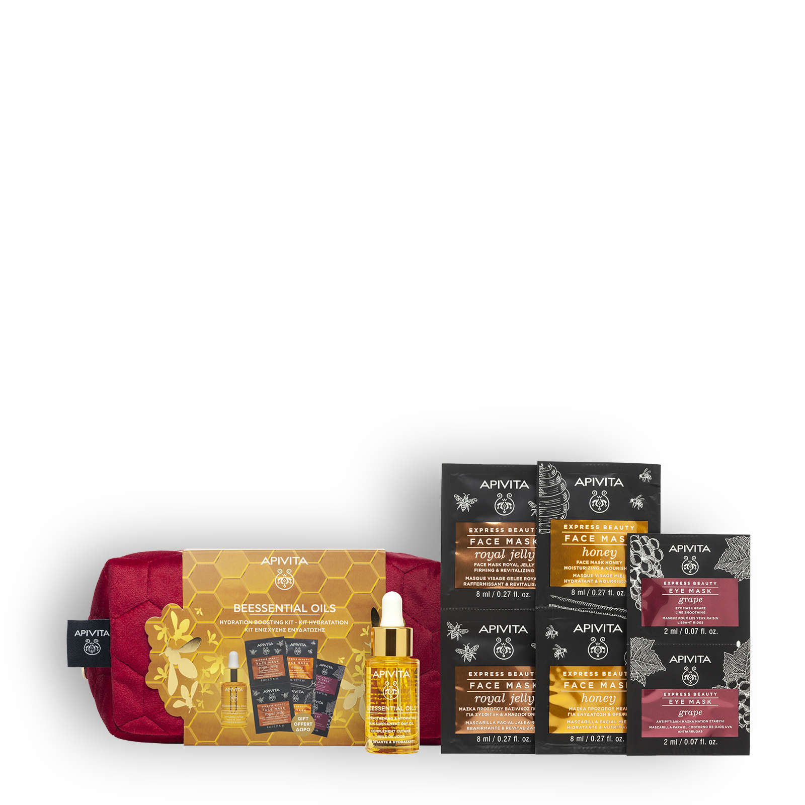 Get ready to glow up this holiday season with our BEESSENTIAL OILS chic and festive pouch. A complete facial set for ultimate hydration, perfect for gifting or self-care.